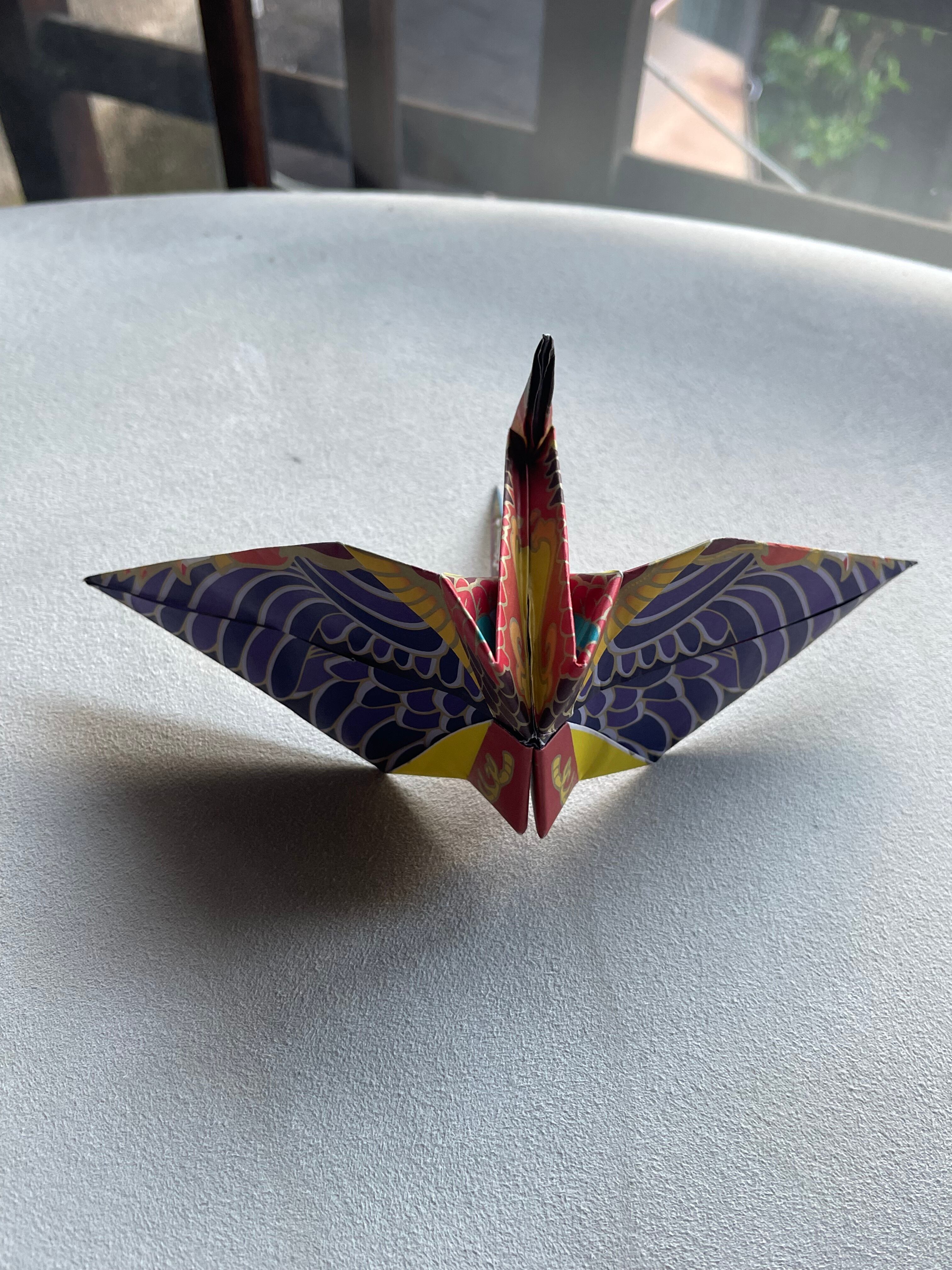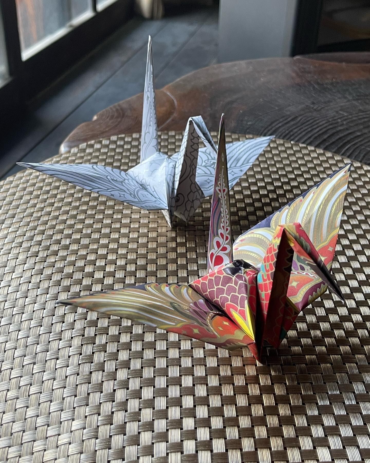 折り紙の鶴をモチーフに、京都を守る四神・南の守護神・朱雀をデザインしました。25x25cmの少し大きめの折り紙です。彩色バージョン、モノクロ銀色バージョンがございます。